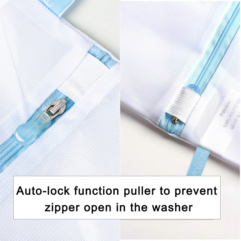 Our wash bags are made of high-quality polyester mesh with neat holes, allows water and detergent easily getting through with good cleaning. Strengthened rust-proof auto-lock function zippers with elastic band protector to avoid the zipper open in the washing machine. Materials of these laundry bags are complied with California Prop 65 Regulation, Lead Free, Cadmium Free, and Phthalates Free.