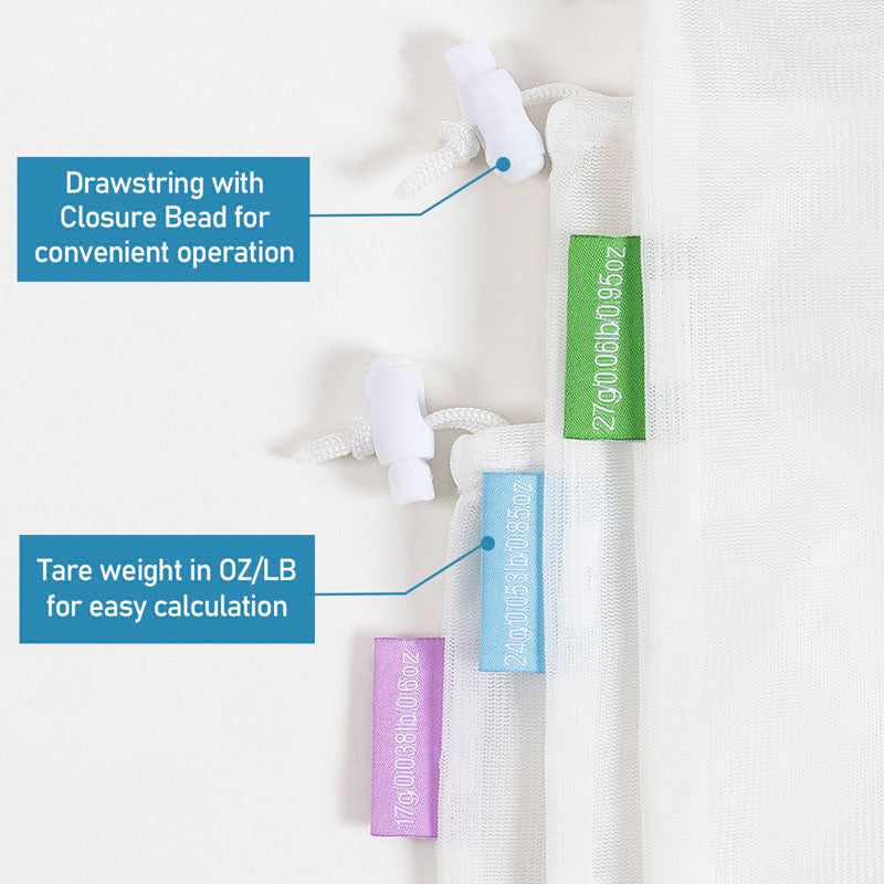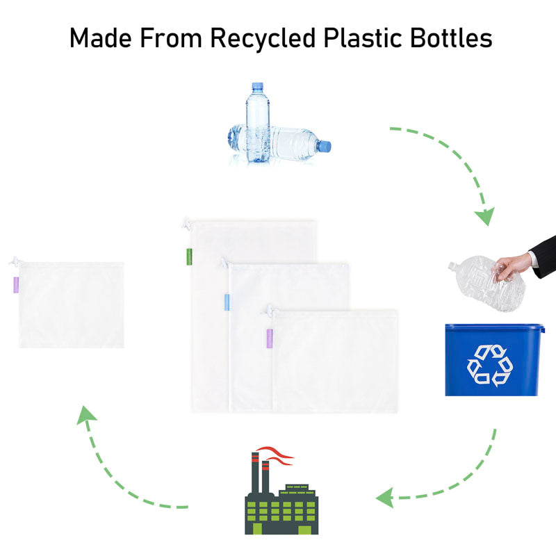 Our produce bags are made of FDA Standard Food Grade mesh. It’s BPA Free, Lead Free and Phthalates Free. The mesh is 100% recycled from plastic bottles to save our planet. Using our produce bags not only reduce to use plastic bags, but also find solutions to recycle the used bottles.